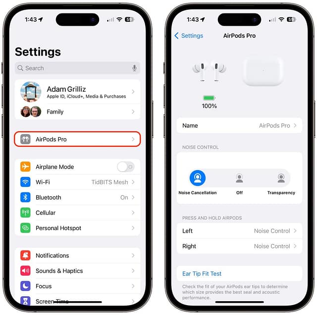 If you sometimes have trouble configuring your AirPods, here’s the trick. The AirPods settings screen is available only when the AirPods are connected to your iPhone, so you must open their case or put them in your ears. Once you do that, a new item with the name of the AirPods appears at the top of the Settings app. Tap it to switch between Noise Cancellation and Transparency, configure what the press-and-hold action does, and start ear tip tests.