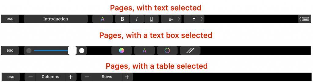 App controls are in many ways the most interesting because they change not just when you switch between apps, but also based on what you’re doing in an app. Take Pages, for instance. If you’re working with text, Pages configures the Touch Bar to show buttons that let you switch between paragraph styles, apply character formatting, and tweak horizontal and vertical justification. That button on the far right displays auto-complete options for the word you’re typing. But if you have a text box selected, Pages instead provides buttons for opacity, various colors, and line strokes. Select a table, and Pages immediately offers options for adding and removing columns and rows.