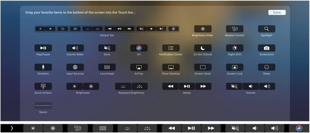 You have two choices here, what appears in the Touch Bar normally, and how it changes if you press the Fn key in the lower-left corner of the keyboard. Your options include: