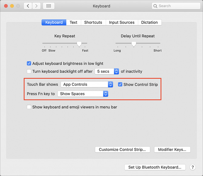 - F1, F2, etc. Keys: Aimed at keyboard traditionalists, this option mimics the F-keys that occupy the Touch Bar’s position on every other keyboard in the universe. People often use these keys as hot keys with macro programs like Keyboard Maestro.