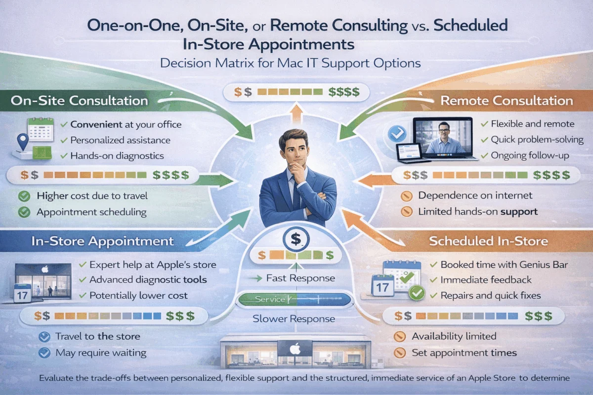 When your Mac crashes during a critical project deadline, or your team struggles with device management across multiple locations, the support option you choose can make the difference between a minor hiccup and a business-disrupting crisis. The debate between one-on-one, on-site, or remote consulting vs. scheduled in-store appointments has become increasingly relevant as businesses demand more sophisticated technology solutions that go beyond basic troubleshooting.