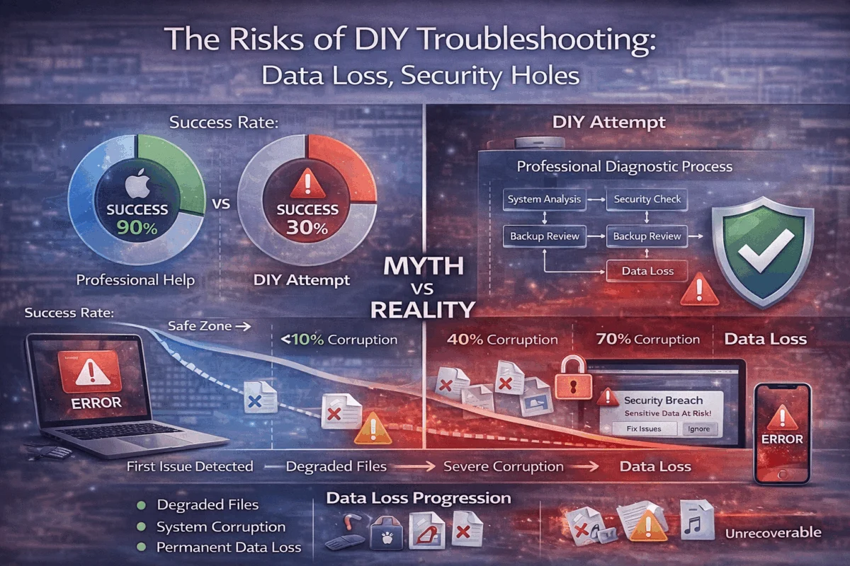 The risks of DIY troubleshooting (data loss, security holes) extend far beyond temporary inconvenience, potentially leading to permanent data loss, security vulnerabilities, and business disruption that cost significantly more than professional intervention. While the appeal of quick fixes and apparent cost savings makes amateur troubleshooting tempting, the reality involves complex technical challenges that require specialized expertise, professional-grade tools, and systematic approaches that protect data integrity while resolving underlying problems.