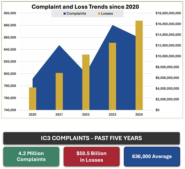 According to the FBI’s Internet Crime Complaint Center (IC3), cybercrime-related losses from 2020 through 2024 are estimated at $50.5 billion, with IC3 receiving 4.2 million complaints. Most concerning is the rising trend in the frequency and severity of these attacks.