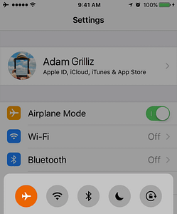 To turn these wireless features back on, tap the grayed-out Wi-Fi and Bluetooth buttons in Control Center, or flip their switches in Settings > Wi-Fi and Settings > Bluetooth. Don’t bother turning them on unless you’re going to use them, though, since you’ll save a little battery life by leaving them off for the duration of a long flight.