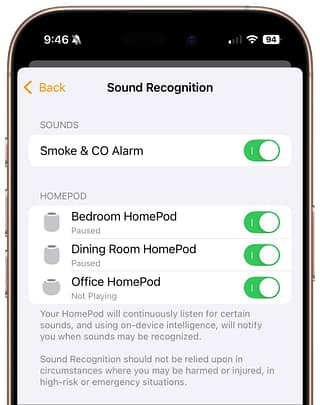 Although we think about HomePods as being useful for playing audio and responding to Siri commands for HomeKit devices, they can do more. HomePods can send a notification to your iPhone if their built-in microphones recognize the piercing squeals from smoke and carbon monoxide alarms. If you are away from home, that notification could help you alert neighbors and call 911, shaving minutes off response times. To turn the feature on, open the Home app, tap the ••• button in the upper-right corner, navigate to Safety & Security > Sound Recognition, and turn on the switches for Smoke & CO Alarm and any HomePods you have.
