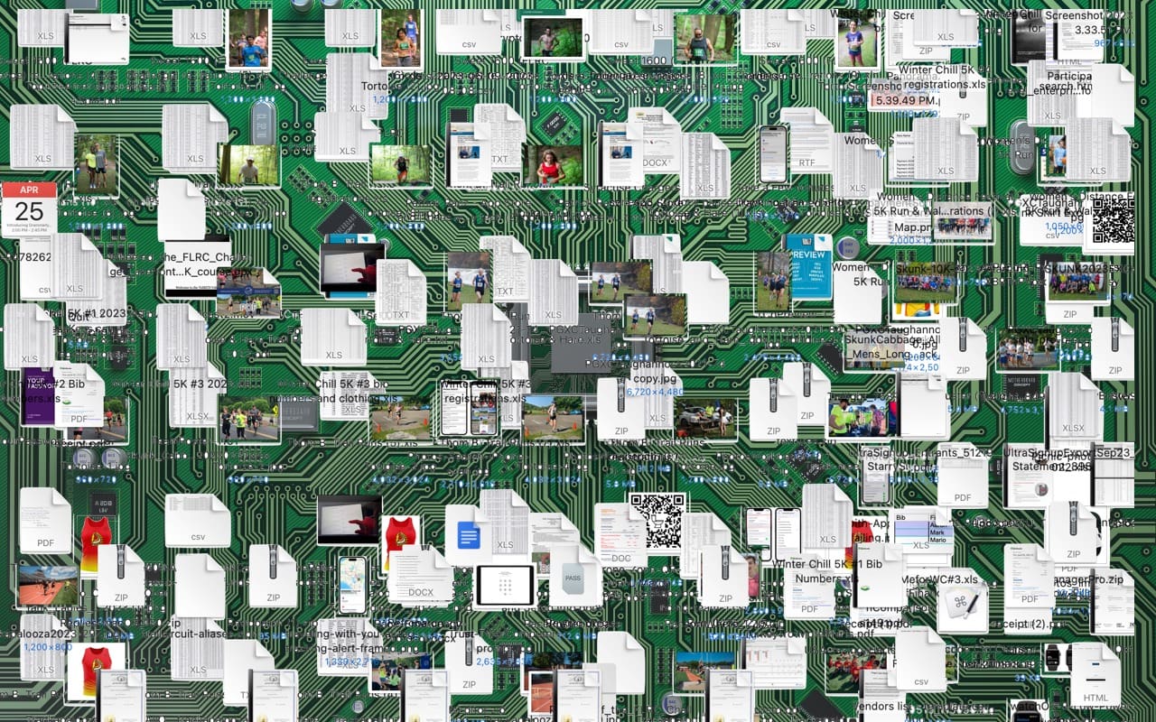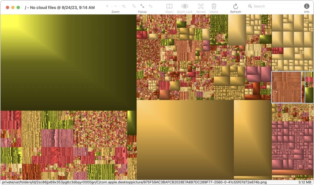 In the screenshot below, the big boxes of color are massive virtual machine disk images, and the selected folder outlined in white at the right contains desktop pictures downloaded by an app that rotates them regularly—gigabytes of old files that can easily be deleted.