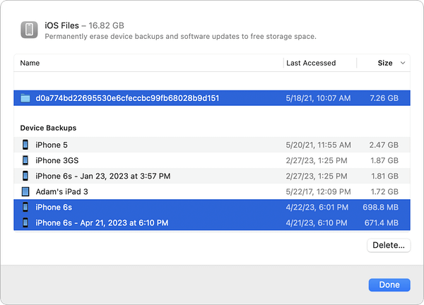More interesting are the Applications, Documents, and iOS Files categories, each of which may reveal gigabytes of unnecessary data. iOS Files, for instance, shows any device backups and software updates stored on your Mac’s drive. It’s worth keeping the latest backup of devices you still use, but delete any older backups and updates that are just wasting space—well over 8 GB in the screenshot below.