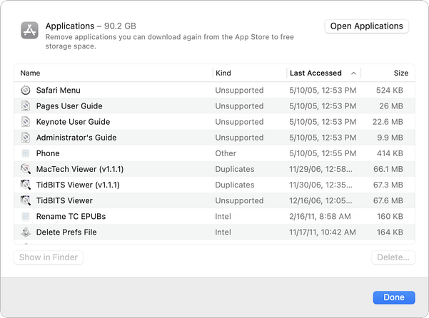 The Applications category lists your apps and is sorted by size by default. But try clicking the column header for Kind and scrolling down. You can probably delete most apps tagged as Unsupported, Duplicates, or Older Versions. Similarly, click the Last Accessed column header to see which apps you haven’t launched in years. Many of them can probably go, too.