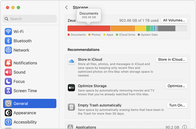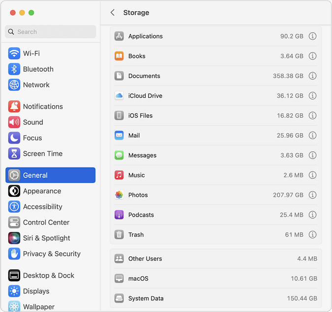 Apple first introduced its Storage Management tool in the System Information app in macOS 10.12 Sierra, making it accessible from the About This Mac dialog. Starting in macOS 13 Ventura, Apple moved those capabilities to System Settings > General > Storage, providing a quick overview of your drive usage at the top. Hover over each colored bar to see how much space is taken up by a particular type of data. The light gray space at the end of the bar is what’s still available.