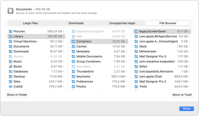 In any of these views, click Delete or Move to Trash to remove the file or Show In Finder to see it in its native habitat, which may help you decide if you should keep or delete the file. To delete multiple files at once, Command-click or Shift-click to select them and then click Delete to remove them all at once.