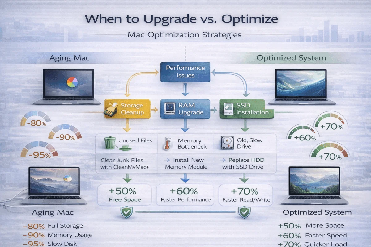 • Strategic hardware upgrades like SSD installations and RAM increases often provide better ROI than new purchases for Macs under 5 years old