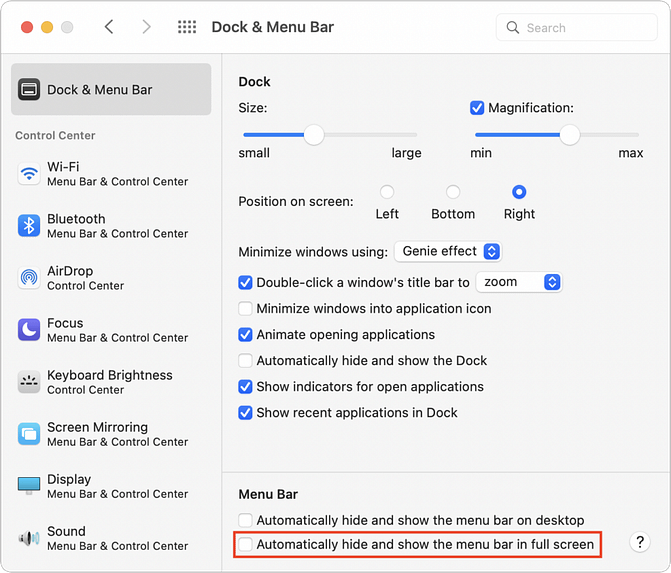 Do you like using full-screen mode on your new M1-based MacBook Pro but hate having the menu bar disappear unless you move the pointer to the top of the screen? Happily, in macOS 12 Monterey, Apple has at long last added a setting to keep the menu bar visible at all times. Open System Preferences > Dock & Menu Bar and uncheck “Automatically hide and show the menu bar in full screen.” The change won’t affect apps currently in full-screen mode until you toggle their window state again or quit and relaunch. Unfortunately, some apps, including Apple’s Photos, need to be updated to show toolbars or other controls at the top of the window without forcing you to mouse up there to reveal them.