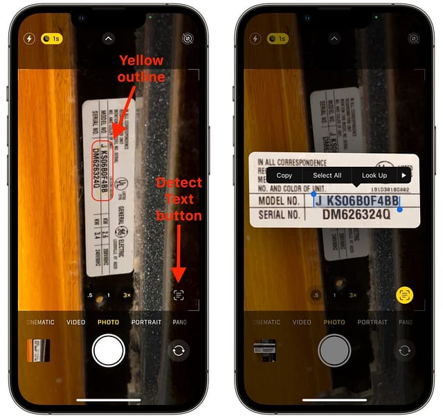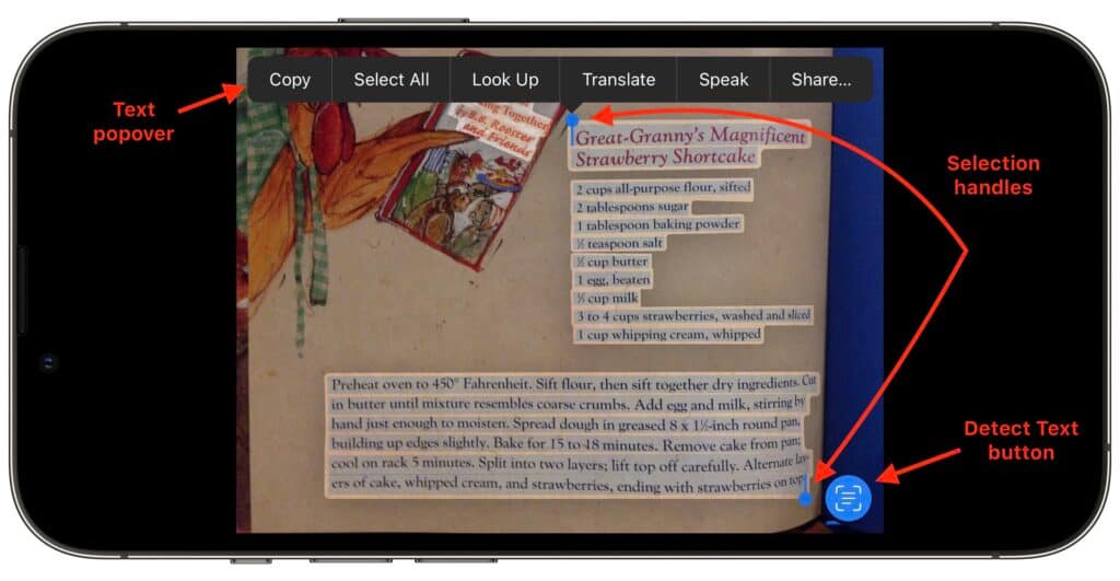 Sometimes you may want to capture some text in the real world without having a photo to store and later delete—getting an appliance’s model or serial number is a perfect example. When Live Text detects text in the Camera app’s viewfinder, it puts a faint yellow outline around it and displays the Detect Text button. Tap the Detect Text button to freeze and zoom the selection—it even rotates sideways text to be readable—and then tap the text to select and copy it. Tap the Detect Text button again when you’re done.