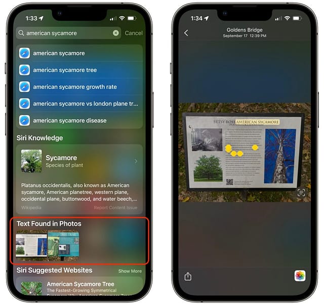 As a bonus in iOS 15 and iPadOS 15, text from Photos that Live Text has recognized is indexed by the system-wide search. So when you pull down from the middle of the Home screen and search, a Text Found in Photos section shows images that contain the search text. Tap one to view it, and note that there’s a Detect Text button in the preview that identifies text you can select right there. Or tap the Photos button in the lower-right corner to open the image in Photos.