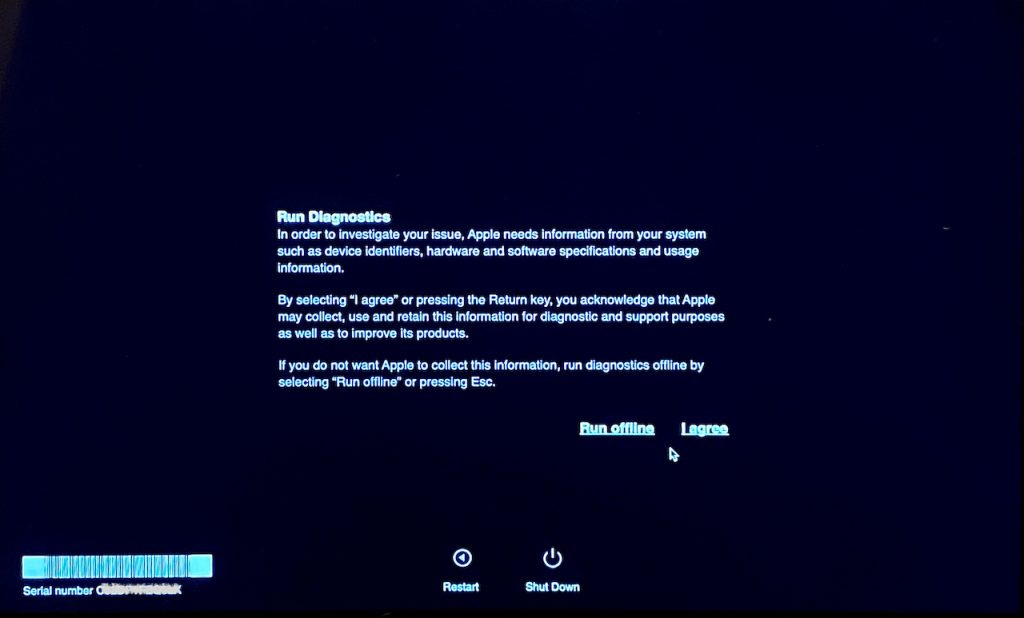 Once you’re in the Startup Manager screen, press and hold Command-D to reboot the Mac into the Diagnostics Loader app. You can choose to run the diagnostics offline or to share the information with Apple.