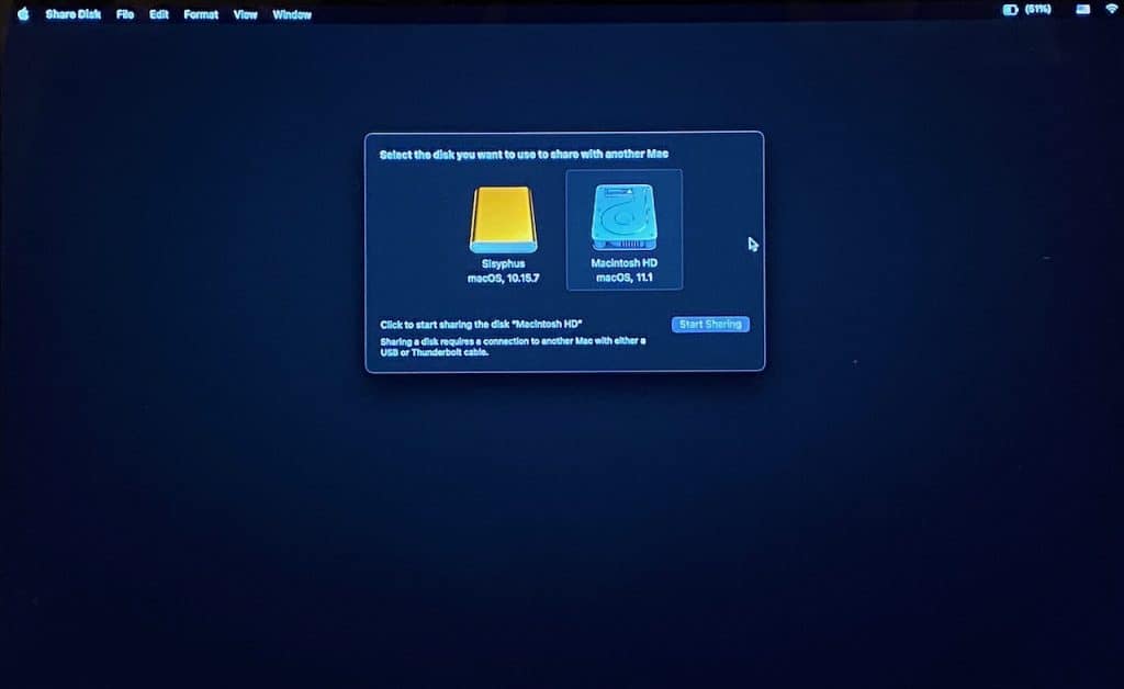 Choose Utilities > Share Disk to start sharing one of the M1-based Mac’s drives via Target Disk Mode. Select the drive and click Start Sharing. When you’re done using it, click Stop Sharing before disconnecting the cable.