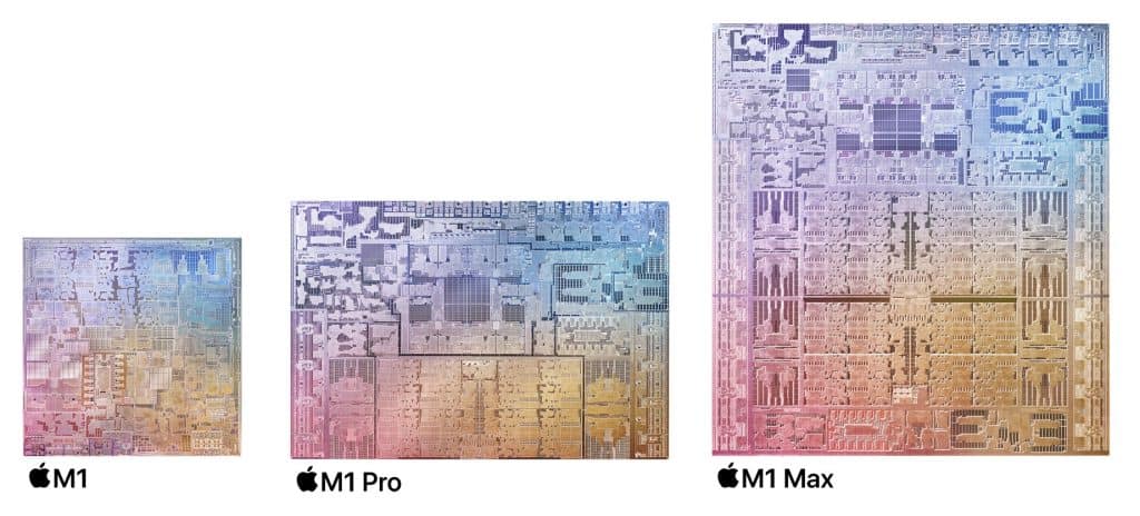 - M1 Max: The M1 Max has the same 10-core CPU as the M1 Pro but provides a massive 32-core GPU with up to four times the performance of the M1. The largest chip Apple has ever made, the M1 Max offers either 32 GB or 64 GB of memory, and it doubles the M1 Pro’s memory bandwidth to 400 GBps, nearly six times faster than the M1. A lower-cost M1 Max configuration has a 24-core GPU.