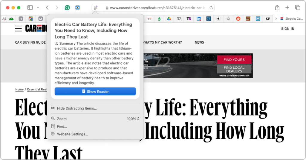 With Apple Intelligence on a Mac with Apple silicon, Reader also offers to summarize long articles. It may also provide a table of contents if the article contains appropriate headings, but it’s hard to predict when that will work.
