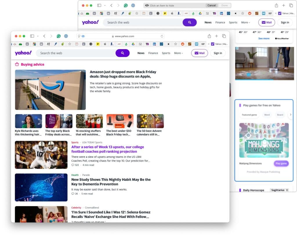 To clean up a Web page, click the Page menu and choose Hide Distracting Items. Then, move the pointer over areas of the screen you want to remove—if Safari can identify an item as a discrete object, it will gain a blue outline. Click it to make it disappear in a cloud of digital dust. Additional clicks will remove more items; Safari keeps count in the location bar. Click the Done button in the location bar to save your changes, or click Cancel if you were just testing. As you can see in the right-hand sidebar of the Yahoo page in the image below, the result is a cleaned-up view with much less distraction.