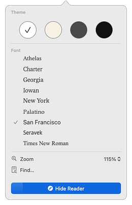Another way to eliminate distractions when reading on the Web is to use Safari’s Reader mode. When you click the Page menu and select Show Reader, Safari reformats the text and images in an article, removing extraneous ads and gewgaws. Once you’re in the redesigned Reader, click the Page menu icon again to access the customization options that let you choose from four color themes, nine different font faces, and various zoom levels