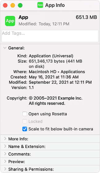 The new 14-inch and 16-inch MacBook Pro models feature a camera housing built into the screen, resulting in a notch like that on the iPhone. Most developers are updating their apps to ensure that no controls or menu bar items appear blocked or hidden by the notch, but if you use an older app that doesn’t play nicely with the notch, there’s a fix. Quit the app if it’s running, select it in the Finder’s Applications folder, and choose File > Get Info. In the Info window that opens, select “Scale to fit below built-in camera.” The active area of the display resizes so everything appears below the notch, slightly reducing the overall screen space. This checkbox won’t appear once the app has been updated to avoid the notch.