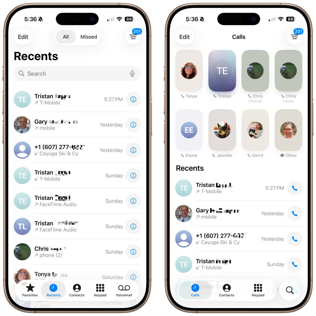 The Phone app has traditionally featured a toolbar with buttons for Favorites, Recents, Contacts, Keypad, and Voicemail, along with a separate Search field. iOS 26 retains this layout as Classic view (below, left) and introduces a new Unified view (below, right) that aims to simplify the interface by reducing the toolbar to four buttons: Calls, Contacts, Keypad, and Search, with the Calls screen combining favorites and recent calls. You can switch between these views by tapping the Filter button in the top-right corner and choosing the preferred layout. The Filter menu also lets you specify which calls appear below, including voicemail.