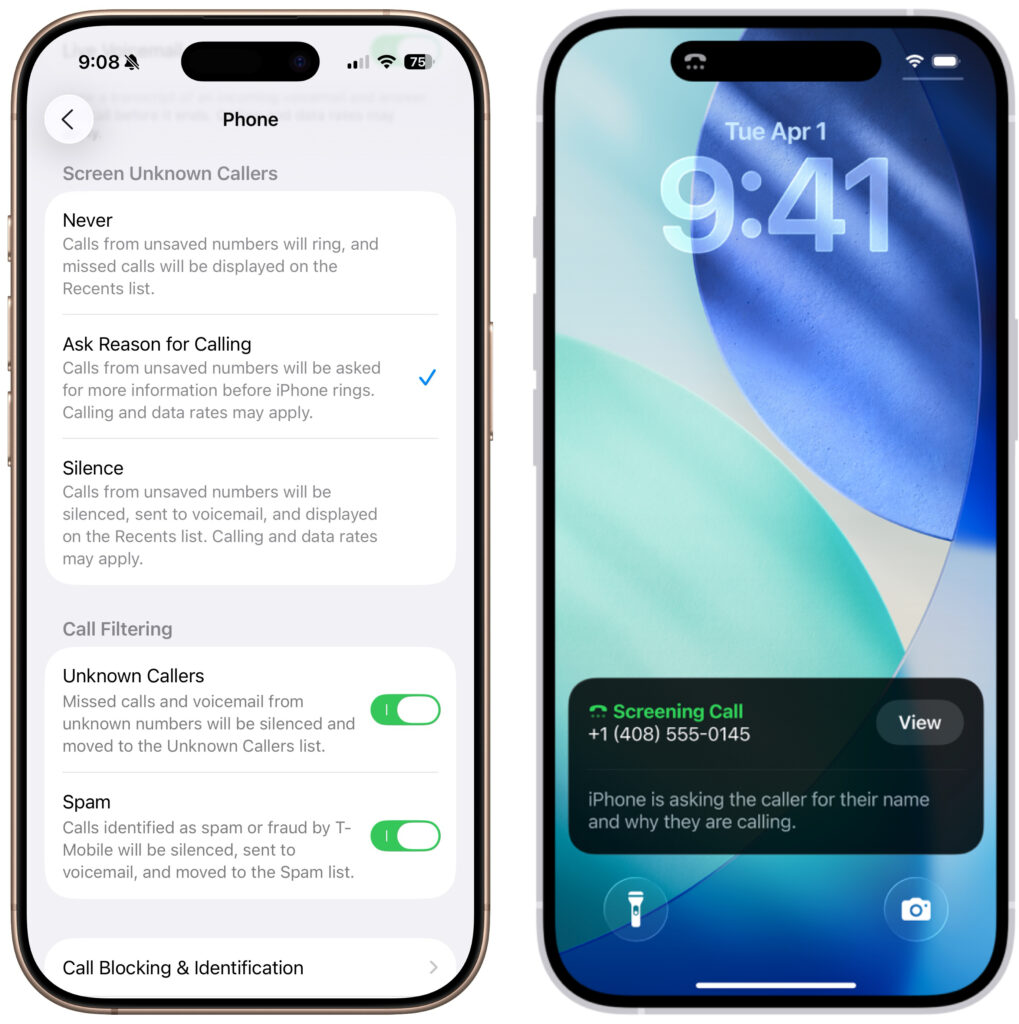 A new Call Screening feature, configurable in Settings > Apps > Phone > Screen Unknown Callers, intercepts incoming calls from unknown numbers and prompts the caller to “state their name and reason for calling” before the iPhone even rings. If the caller responds, you’ll see a transcript or snippet of their response, allowing you to decide whether to answer or ignore the call. In our experience, it mainly causes spammers and telemarketers to hang up instantly, which is equally effective.