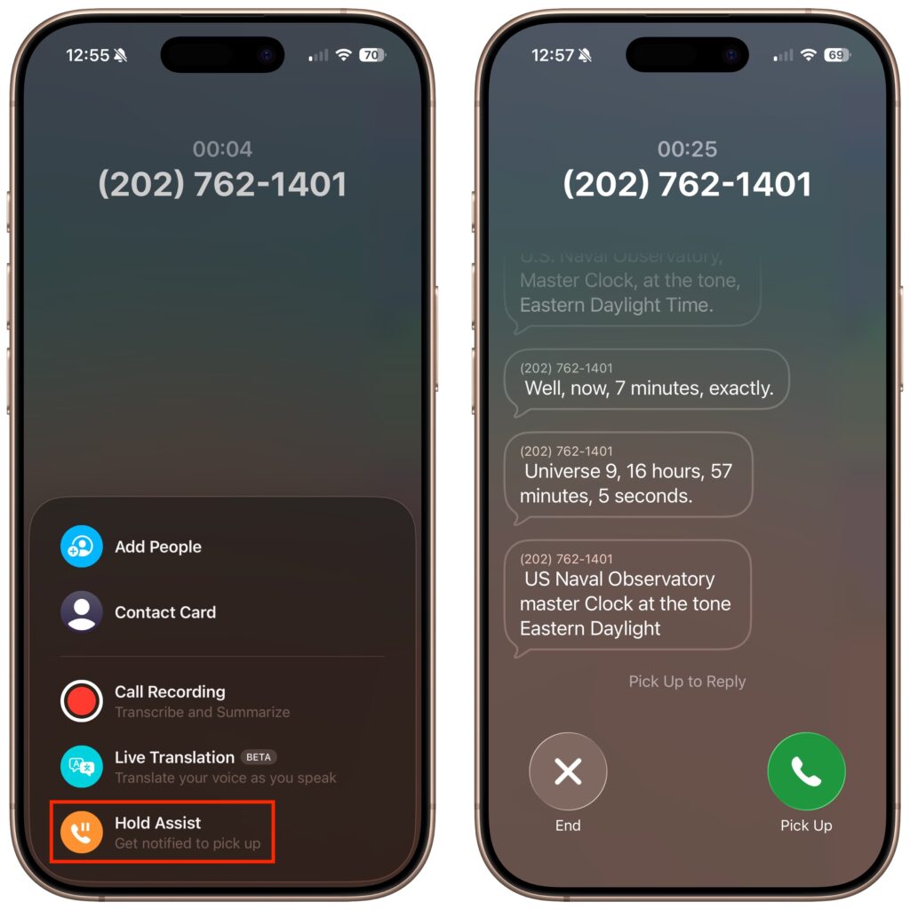 The Phone app’s new automatic Hold Assist feature is somewhat hard to test, but we hope it works when you need it. When Hold Assist Detection is enabled in Settings > Apps > Phone, Apple says that if you’re placed on hold by a customer service agent, the Phone app can detect hold music, silence it, and notify you when the agent comes back on the line. You can also manually tap the More button, tap Hold Assist, and then see a transcript of the hold message while you wait. Tap Pick Up when you’re ready to talk.