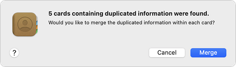 Merge Selected Cards works if you have a small number of duplicates that you can identify easily. However, many people have found themselves in situations where tens or hundreds of contacts have been duplicated, often due to a hiccup in cloud syncing or importing. To help with that too-frequent occurrence, Apple added a feature that looks at all your contact cards and merges those that it determines are duplicates.