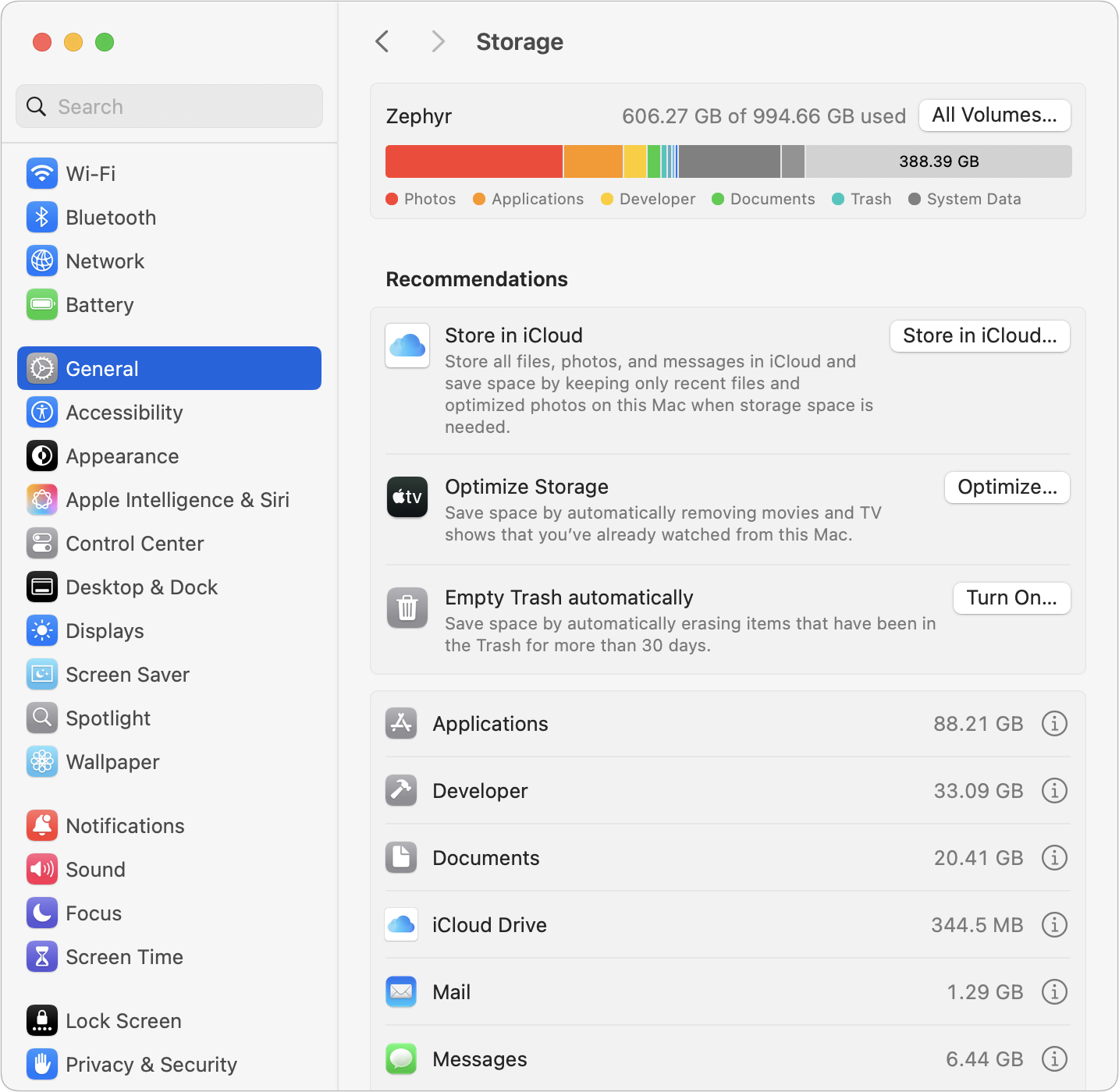 - Clear space: Tahoe may require up to 25 GB of free space to upgrade, and the Tahoe installer itself can take up to 17 GB, so we recommend ensuring you have at least 50 GB free. Don’t cut this close—you should always have at least 10–20% free space for virtual memory, cache files, and breathing room. Check by choosing System Settings > General > Storage; in earlier versions of macOS, choose About This Mac from the Apple menu and click Storage. System Settings provides quick ways to free up space. For iCloud Drive users, another easy way to save space is to Control-click large folders and choose Remove Download to “evict” the local versions of those files temporarily; Box, Dropbox, and Google Drive have similar features.